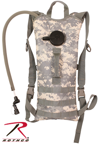 Acu hydration system with quick release shoulder straps. Molle compatible. Made of 600 denier polyester with top and front carry handles. Stretch fabric covered plastic hose with soft bite valve. 3 liter capacity.